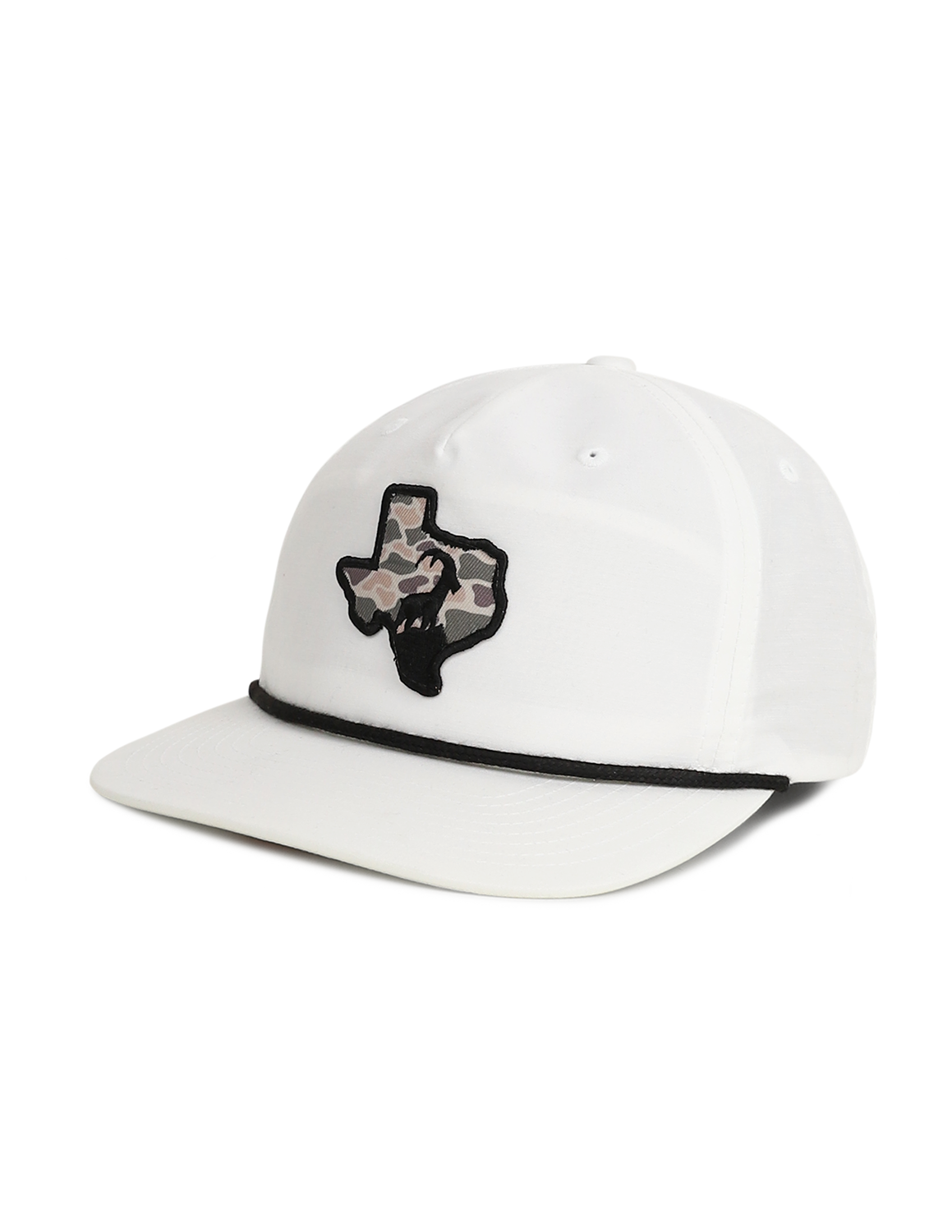 A hat built like Texas—bold, rugged, and unbothered by the heat. The “Camo Ibex Texas” Hat brings together backcountry grit and Lone Star pride with a clean, modern profile. The flat bill and classic mid-pro crown give it just the right shape, while the white rope detail adds a touch of vintage edge.