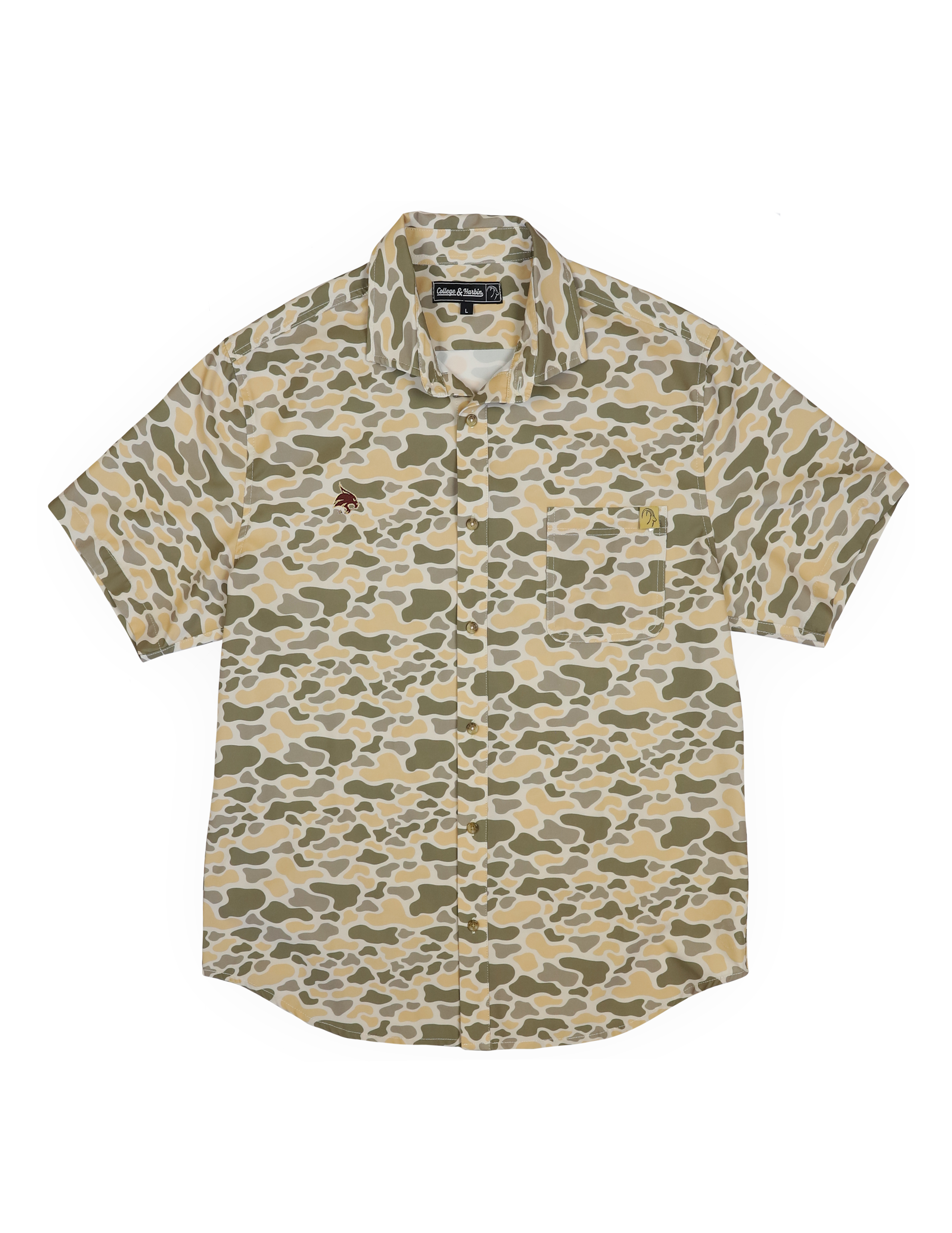 Equal parts sharp and functional, The Burk is the short-sleeve button-down built for the heat and hustle of life outdoors—now finished with an embroidered TXST Bobcat logo laid clean over our signature Cripple Creek Camo.