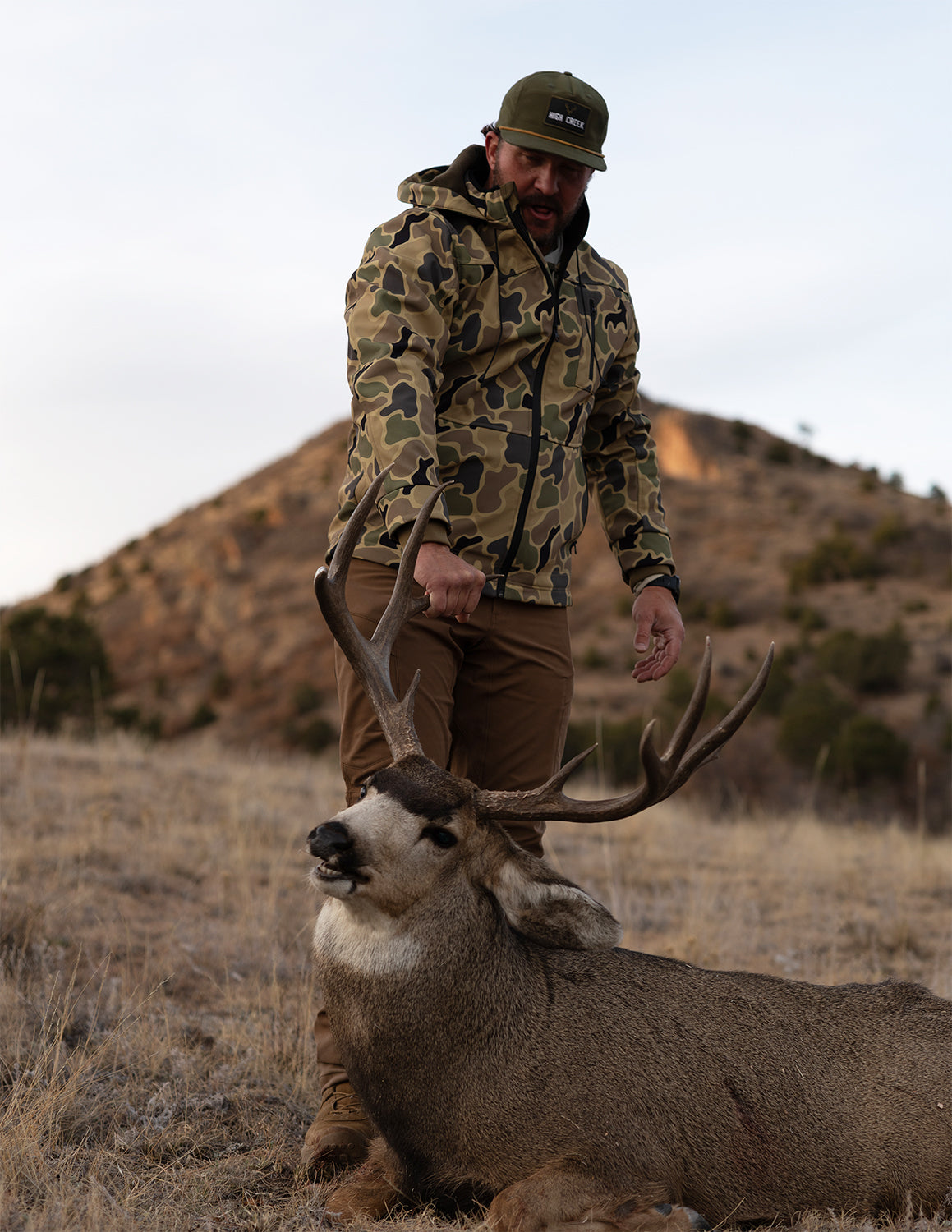 Built for the hunt, the haul, and everything in between, The Big Mitch in Cripple Creek Camo is your ultimate all-season shell. Designed with a water-resistant softshell fabric and a custom camo pattern inspired by the brush, timber, and dry creek beds of the high country, this jacket blends seamlessly into the land it was made for.
