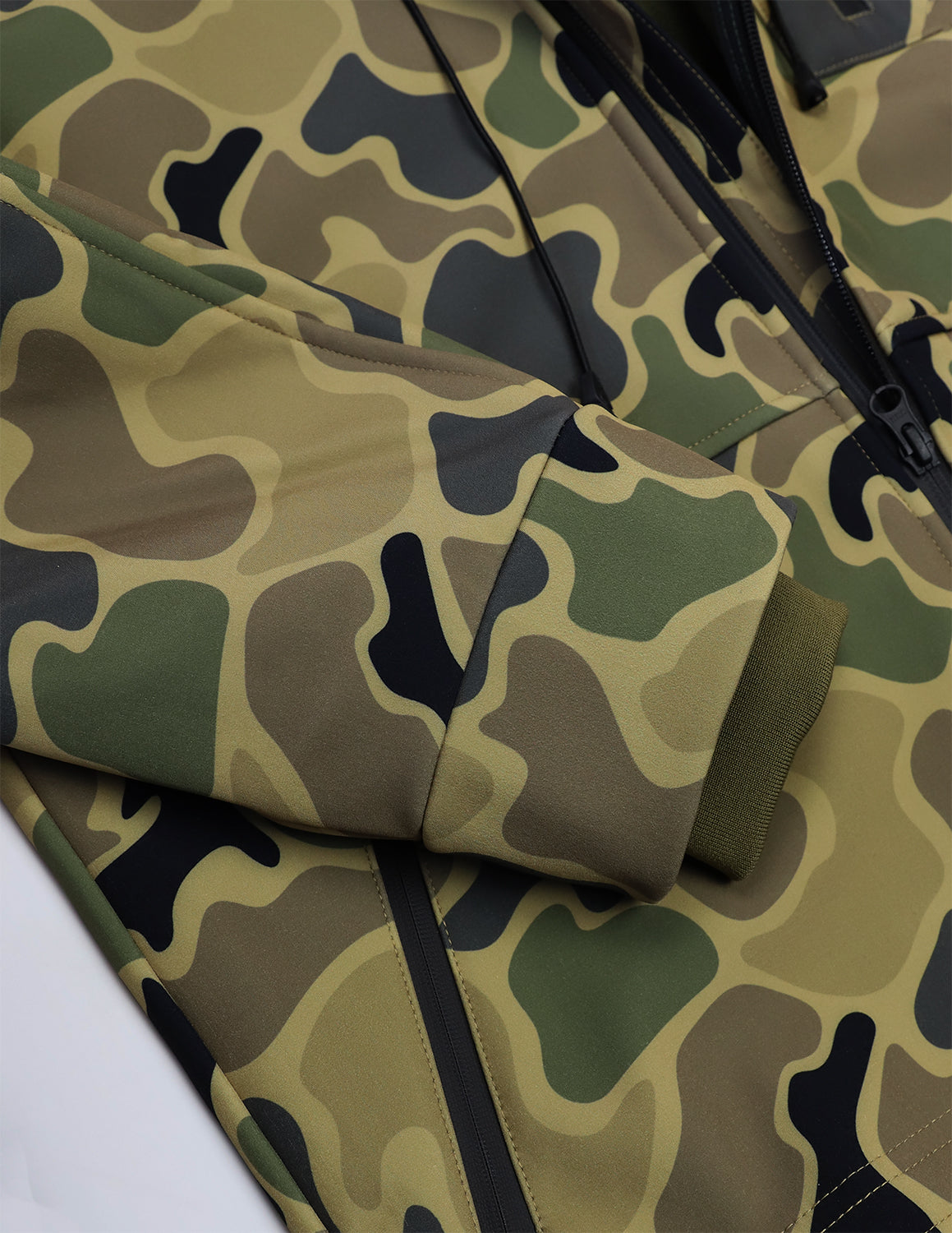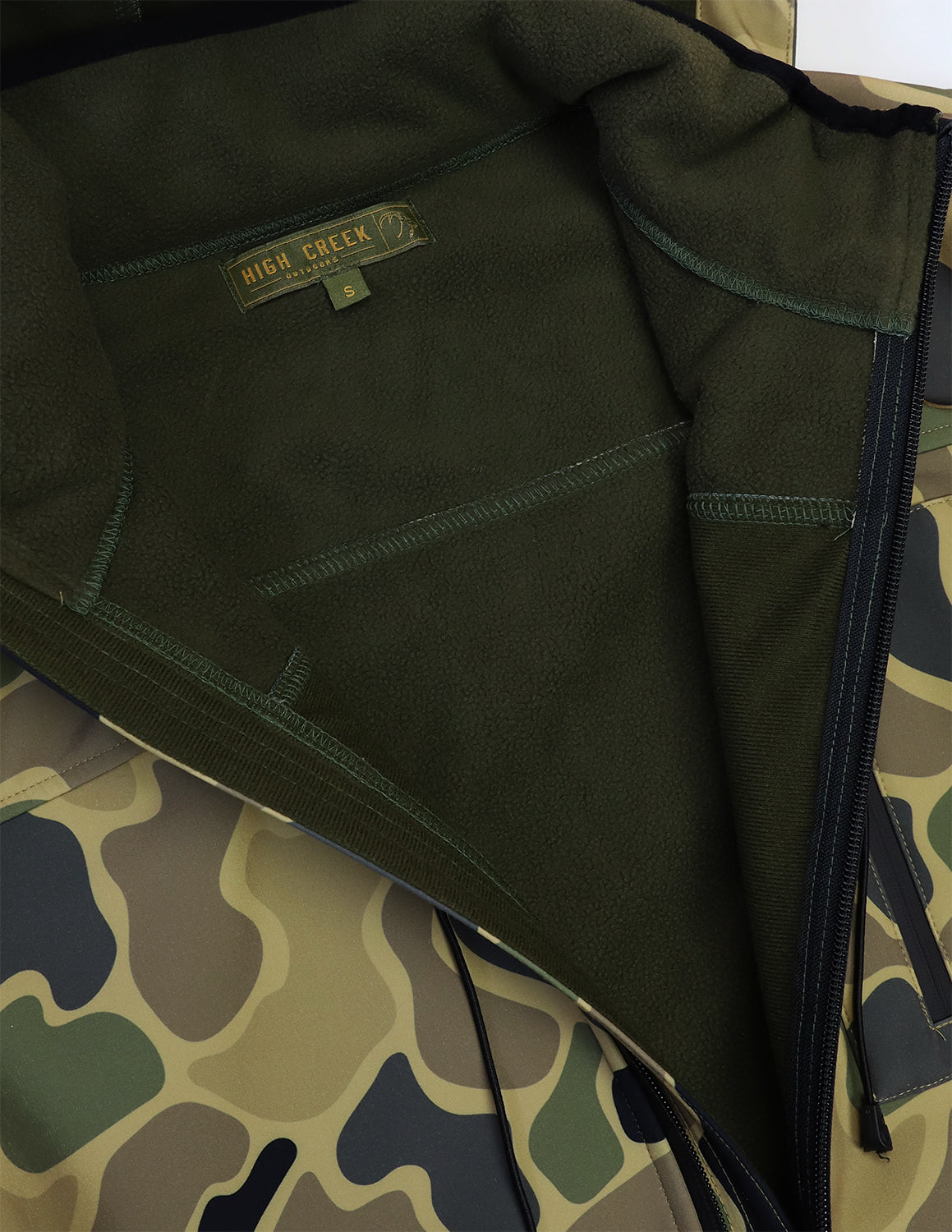It features three zippered pockets—including a vertical chest pocket for secure access—and a full-coverage hood lined with soft olive fleece for added warmth. The athletic cut and stretch fabric allow for unrestricted movement, whether you're stalking elk or stacking firewood.